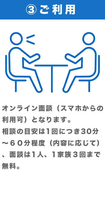 相談目安は1回につき30分〜60分程度(内容に応じて)、面談は1人、1家族 3 回 まで無料です。